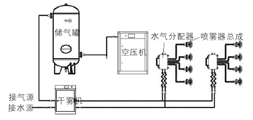 微霧抑塵裝置采用模塊化設(shè)計(jì)技術(shù)。由微霧機(jī)/干霧機(jī)、螺桿式空氣壓縮機(jī)、儲(chǔ)氣罐、噴霧器總成、微霧箱總成/水氣分配器、微霧箱總成控制器、水氣連接管線、電伴熱系統(tǒng)和自動(dòng)控制系統(tǒng)等組成。